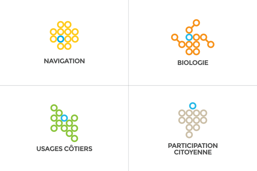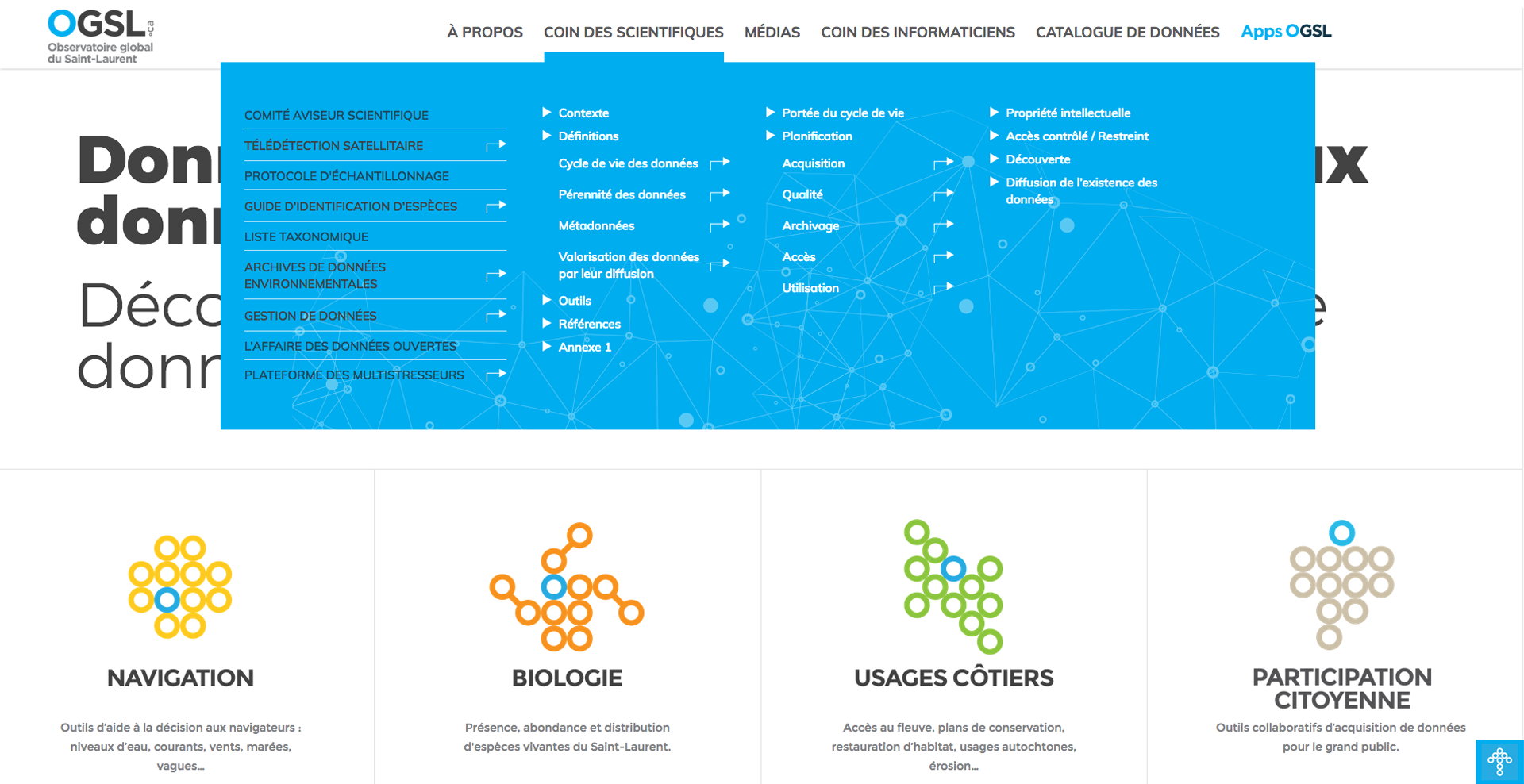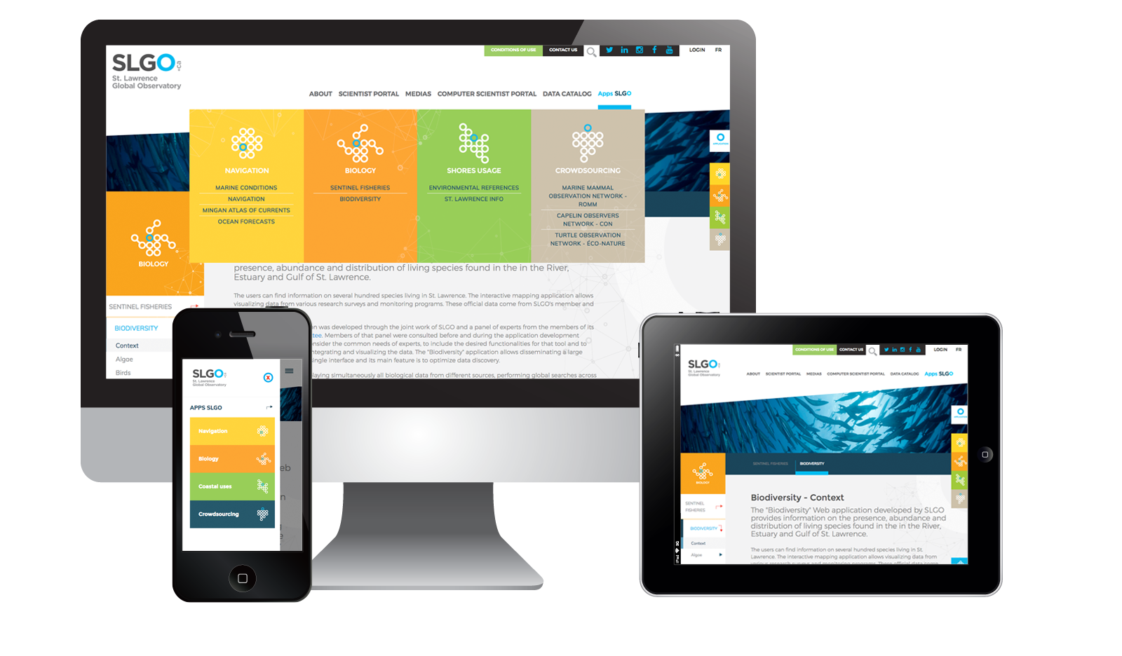 A significant amount of information regarding the entire St. Lawrence – Great Lakes ecosystem is produced on a continuous basis by various organizations operating within the territory (ministries, research organizations, management organizations, etc.). Our challenge was to reflect this visually. Solution: a data grid with intersecting points that was overlayed on the St. Lawrence river to show the significant impact SLGO has for its stakeholders.